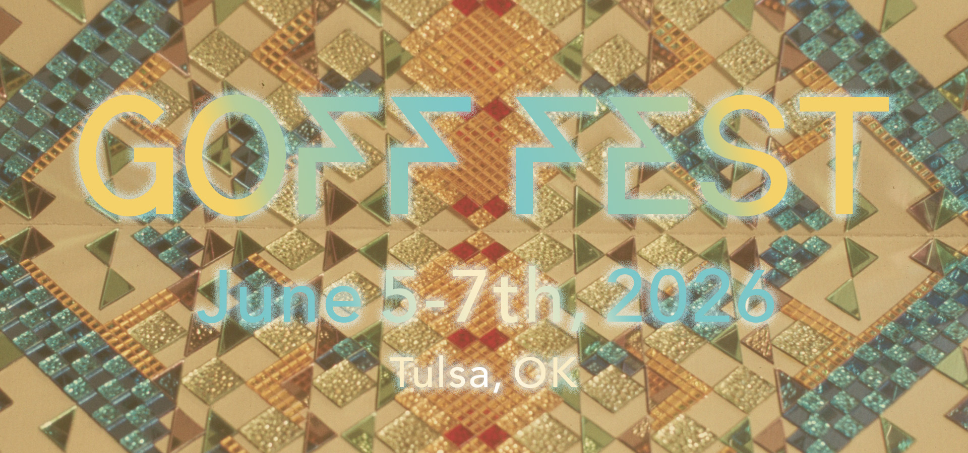 The Goff Fest is proudly organized by the Goff Center of the Continuous Present (GCCP) and is made possible by the generous support of its partners and sponsors, the Tulsa Artist Fellowship, Tulsa Foundation for Architecture, AIA Eastern Oklahoma, The Tulsa Club Hotel, Ross Group, Elote Cafe and Catering, Tulsa Artists’ Coalition, Center for Public Secrets, Tulsa Spotlight Theatre, Friends of Kebyar, Price Tower Arts Center, Tulsa Historical Society, Shuffles Tulsa, OATH Law, Studio 66, H.O.P.E. Testing, Oklahomans for Equality and ahha.